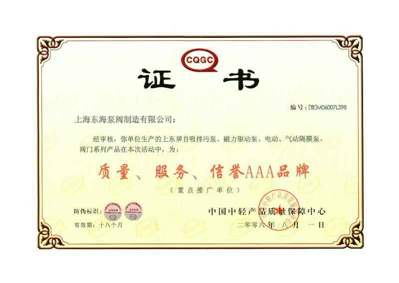 认证,2006年荣获上海市泵阀二十强企业。