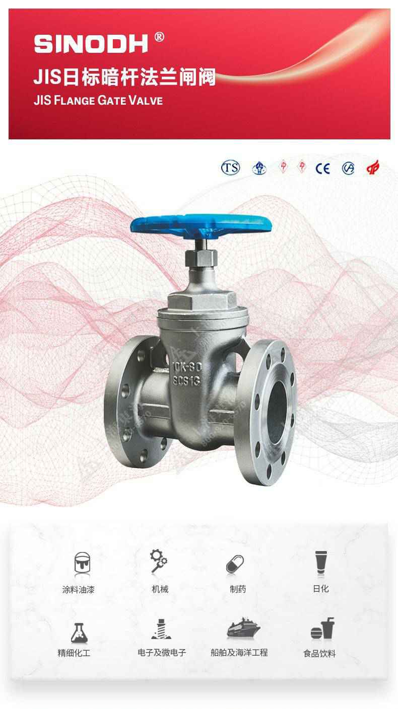 JIS日标暗杆法兰闸阀,为吉林阳光经济咨询服务有限公司自主研发生产。本产品设计制造标准符合JISB2071标准,该产品是一种最常见的启闭阀,利用闸板的上下工作来接通(全开)和截断(全关)管道中的流体介质。