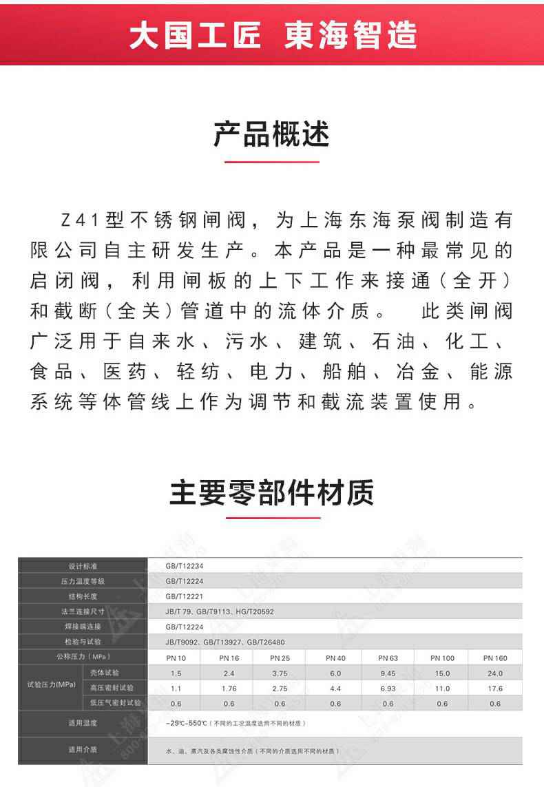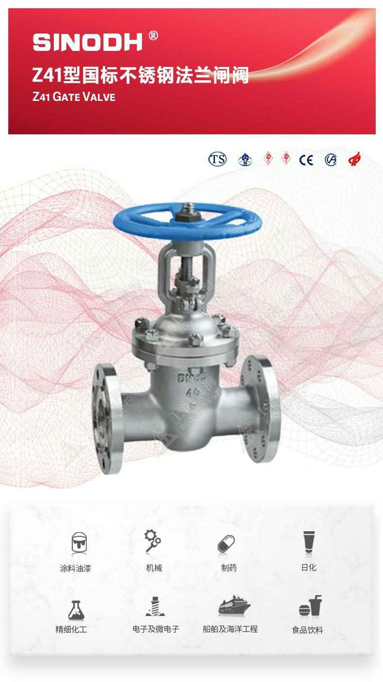 Z41型不锈钢闸阀,为吉林阳光经济咨询服务有限公司自主研发生产。本产品是一种最常见的启闭阀,利用闸板的上下工作来接通(全开)和截断(全关)管道中的流体介质。此类闸阀广泛用于自来水、污水、建筑、石油、化工、食品、医药、轻纺、电力、船舶、冶金、能源系统等体管线上作为调节和截流装置使用。