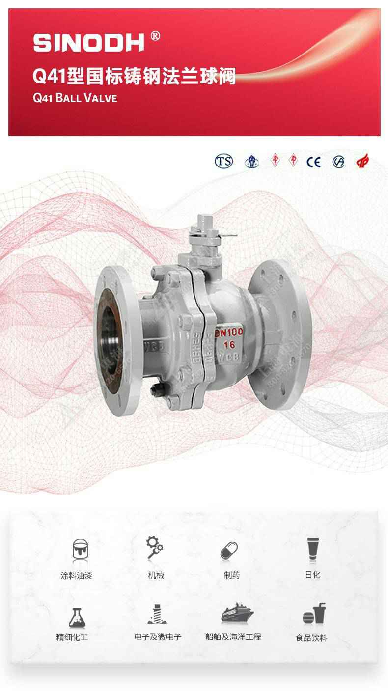 Q41型国标铸钢法兰球阀,为吉林阳光经济咨询服务有限公司自主研发生产。本产品设计制造标准符合GB/T12237、GB/T12224标准。该产品的球体在介质压力作用下球体能产生一定的位移并紧压在出口端的密封面上,保证出口端密封。适用于水、溶剂、酸和天然气等一般工业介质也适用于工况恶劣的介质,如氧气、过氧化氢、甲烷和乙烯等介质。